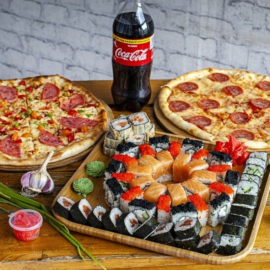 «Филадельфия» ролл (10 шт), «Тотторо» ролл (10 шт), пицца «Пепперони» (30 см), фри(1 порц.), Кола 1л